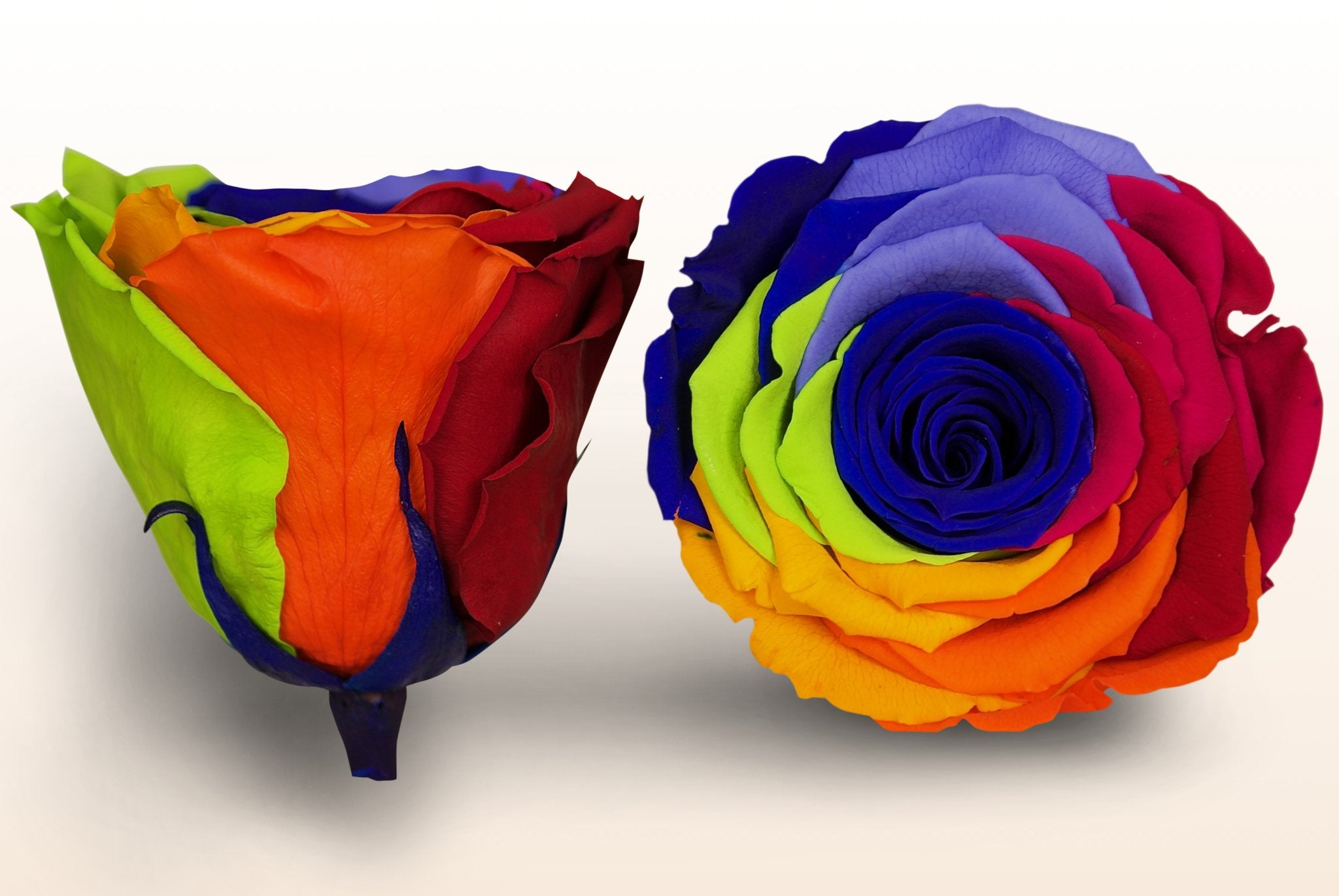 A rose which looks and feels like a freshly-plucked rose, with a silky-soft sheen and which lasts for more than a year! These preserved roses in the shade rainbow blue are very popular among hotel designers, florists and window dressers. The roses are used as buttonholes, as an attractive table decoration at weddings and in the most beautiful flower arrangements. It is an absolute must to use the rainbow blue preserved roses in combination with our exclusive preserved rose petals for spectacular photos.