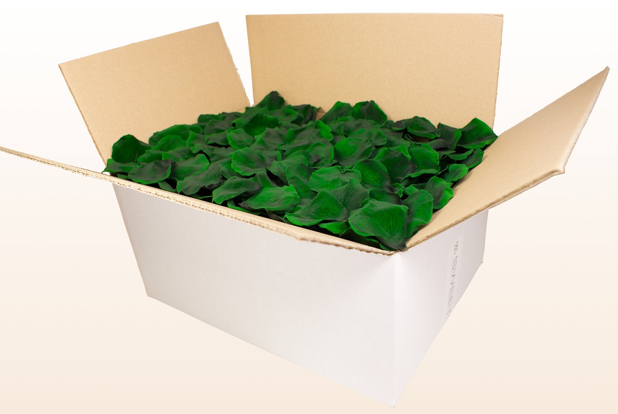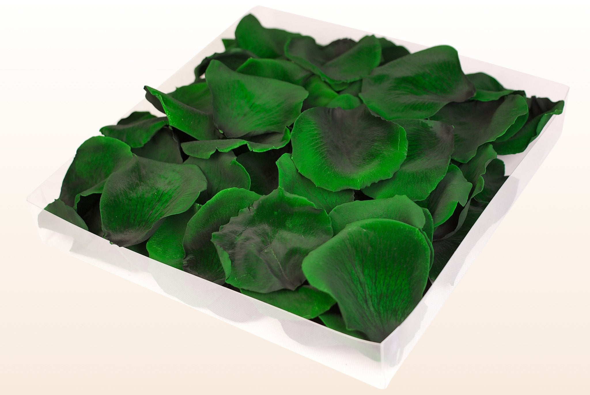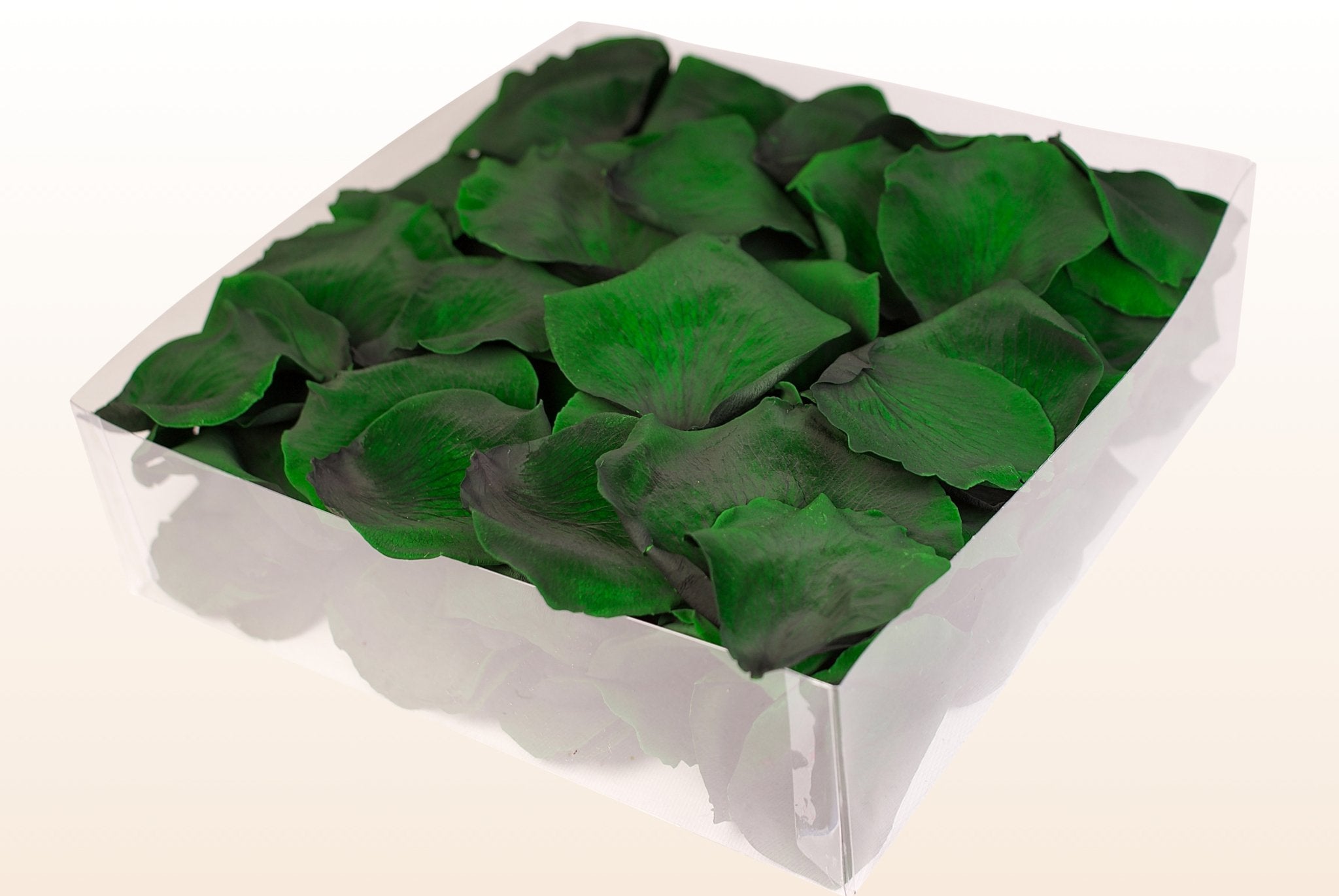Natural rose petals which have been preserved to retain their colour and softness. These preserved dark green rose petals are perfect to use as table decoration or as confetti at weddings. Not completely sure about the colour? Then use our Free sample service. Due to the suppleness of the product, the petals can even be put in an envelope which is ideal when sending out invitations and birth announcements. Our lovely preserved dark green rose petals have been preserved with a glycerine based solution, together with natural food dyes. The preservation process stabilises the colour and leaves the petals look and feel as fresh as the day they were plucked from the rose. The petals in the 1 & 2 litre boxes are presented in a pretty acetate box. The petals in the 8 & 24 litre boxes are gently packed in protection bags to avoid damages.